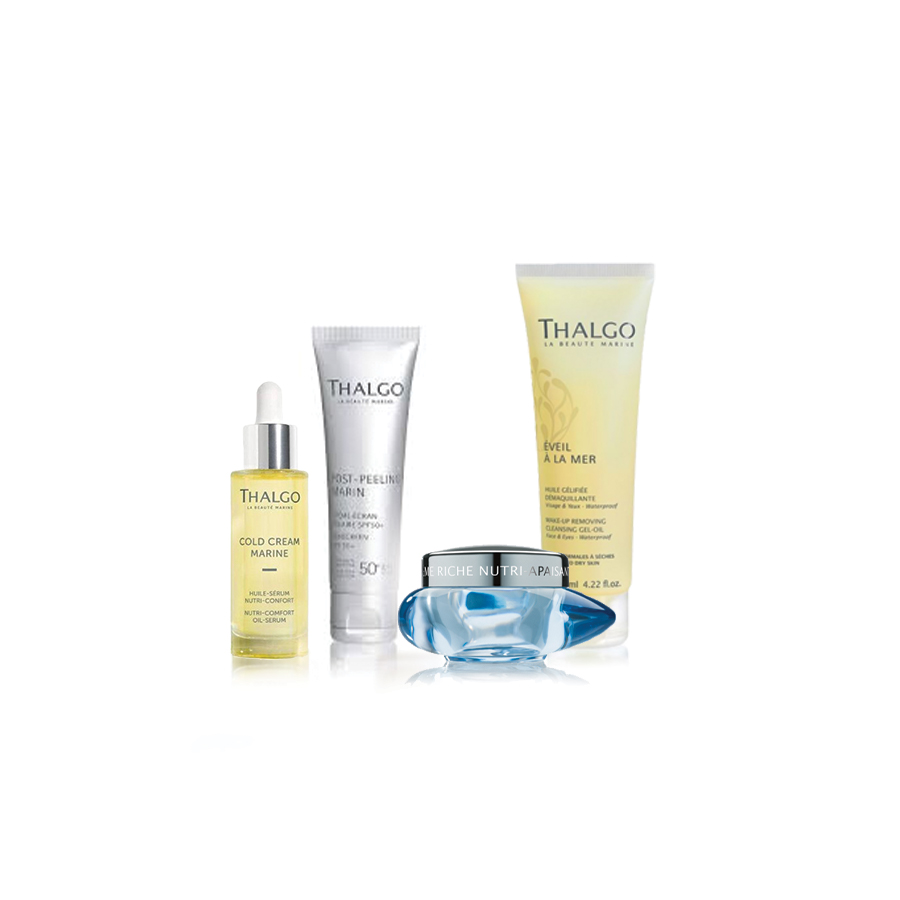 این پکیج مناسب افرادی ست که پوستی خشک و نیازمند به ترمیم و دریافت مواد مغذی را دارد. در این پکیج ژل شوینده ی پوست حساس بصورت روغنی ست، که حاوی روغن آفتابگردان و بادام شیرین با خاصیت نرم کننده و ترمیم کننده ست. سرم مغذی تالگو در این پکیج نیاز پوست شما را از مواد مغذی و ویتامینهایی که افزایش مقاومت پوست بدان نیاز دارد را تامین میکند. و همچنین کرم آرام بخش غنی در این پکیج خشکیهای مقاوم، التهاب و کشیدگی را برطرف میکند. در این پکیج ضدآفتاب مخصوص پوستهای حساس را دارید که از پوست شما در برابر اشعه های مضر و رادیکالهای آزاد محافظت میکند و همچنین این ضدآفتاب خاصیت ضدلک و جلوگیری از تکثیر رنگدانه های پوست را دارد. ۴ محصول مورد نیاز برای ترمیم و مراقبت از پوست خشک و حساس در یک پکیج حرفه ای شما را زودتر به نتیجه ی ایدهآل میرساند.